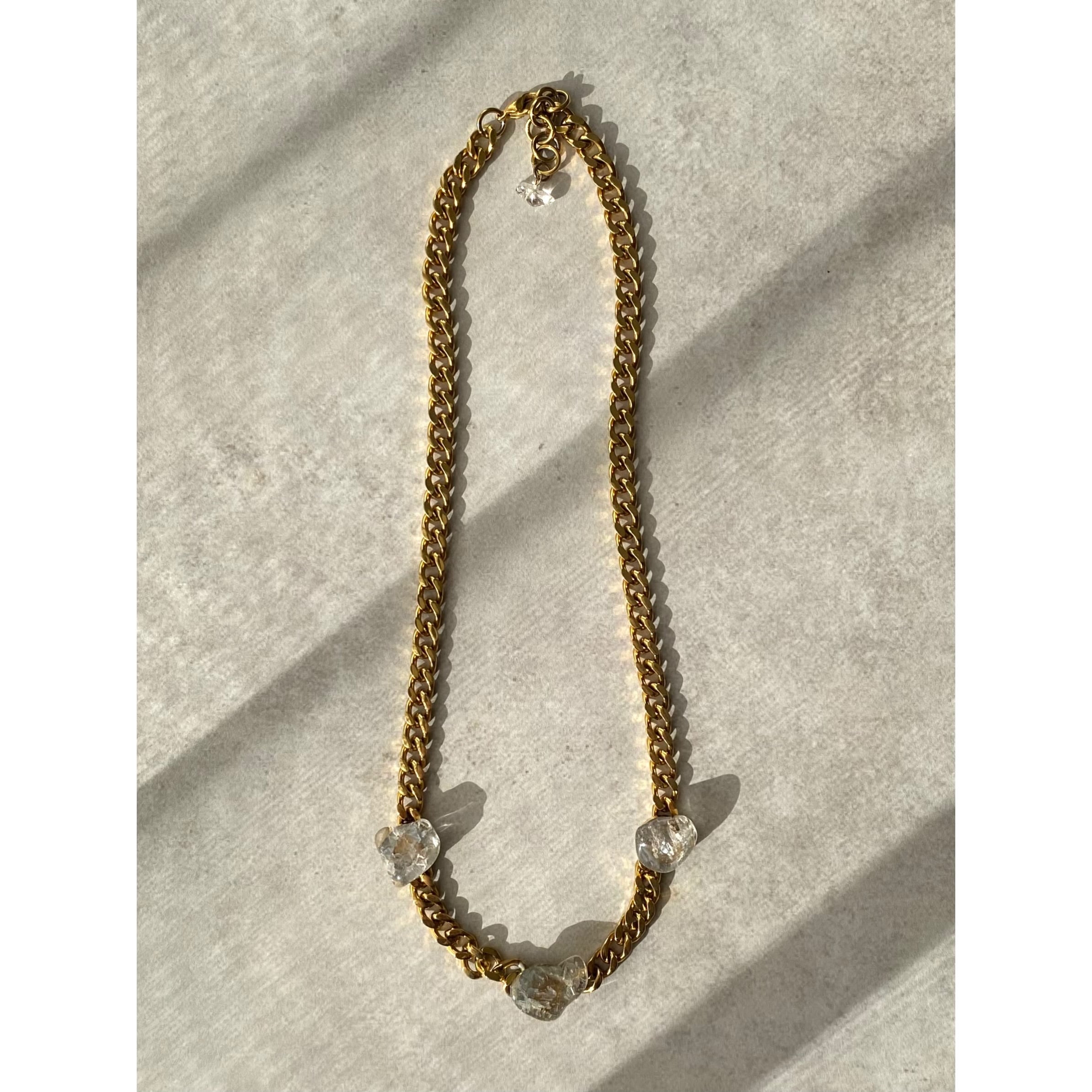 まるで氷のようなラフカットのクオーツがきらめくネックレス。USAヴィンテージ素材からアップサイクルされた一点物のアクセサリーです。ゴールドのチェーンが透明なストーンを引き立たせる個性的なデザイン。シンプルながら存在感がありコーディネートにお洒落な雰囲気をプラスしてくれます。